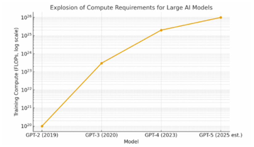 For the purpose of this exercise, I asked ChatGPT to construct a simple chart that shows how compute requirements have grown from the early large language models (GPT-2 in 2019) to the most modern version (GPT-5 in 2025).* It’s easy to see that training compute has grown exponentially in just a few years, and we should expect that to continue over the near-to-medium term.