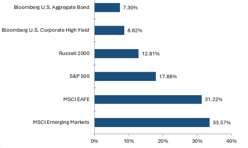 Beyond the U.S, international markets also enjoyed a strong year.45 Both developed markets ex-U.S. and emerging markets recorded solid gains, benefiting from improving economic conditions, easing inflation pressures and strong global demand for semiconductor-related exports.46 Markets with meaningful exposure to the global AI supply chain, particularly in East Asia, performed especially well.47